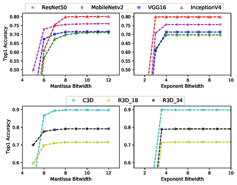 该研究论文中,项目组首次提出使用块浮点计算技术(block floating-point,BFP)对应用于人体动作识别的3D-CNN进行硬件加速,并设计了基于该技术的并行计算的硬件架构(图1)。该项研究相比使用定点数计算的加速器,在不增加数值位宽的情况下大幅度提升了计算精度(图2),从而在保证计算速度的情况下提高了动作识别的准确率。同时该研究也比较了在不同识别准确率下加速器的处理时间,以适用于不同的应用场景。