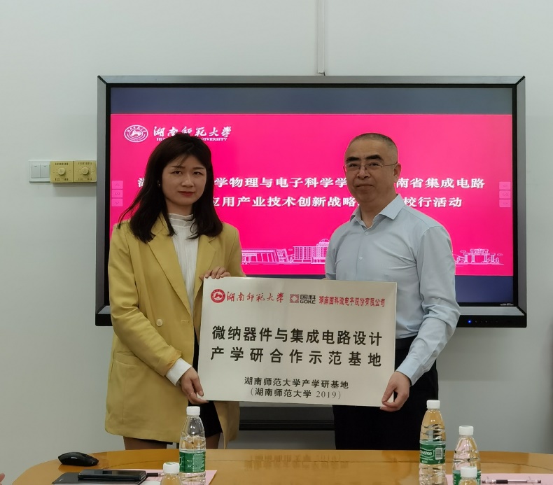 唐东升院长代表学院热烈欢迎联盟领导和企业代表到访湖南师范大学,并介绍了学院的物理与电子学科的发展与双一流建设情况。他表示,学院与企业的校企合作空间很大,可从科学研究、人才培养与社会服务等方面开展深度合作。钱盛友副院长介绍电子系近年来取得的创新成果及成绩:电子信息科学与技术专业获批2020年度国家一流专业建设点,获得湖南省电子信息技术与应用研究生创新基地和微纳器件与集成省级校企合作创新创业教育基地等多个省级平台。唐院长和康书记分别为校外研究生导师颁发聘书和完成产学研基地授牌仪式。