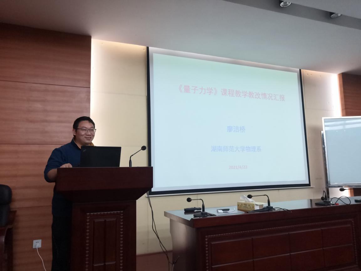 2021年4月22日下午,湖南师范大学第113期教师教学思享会在物理与电子科学学院量子楼410报告厅举行。结合物理系教师教学教研活动,本期思享会主题为“物理课程信息化教学示范”,物理系主任钟显辉教授、物理系副主任及量子物理教学团队负责人廖洁桥教授、湖南省普通高校教师信息化教学竞赛一等奖获得者刘自然副教授担任主讲人。我院原院长荆继良教授、副院长欧阳钢教授、教师教育学院(教师教学发展中心)教师教学能力发展科科长廖志华老师出席,物理系40余位老师参加了此次思享会。