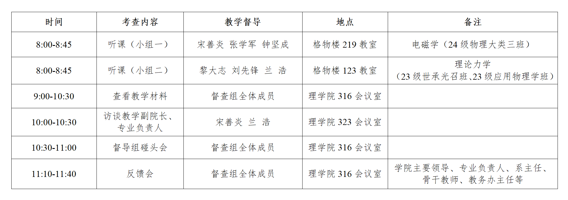 表 1 2025 年 4 月2 2日校督导赴物理与电子科学学院开展本科教育教学督查工作方案