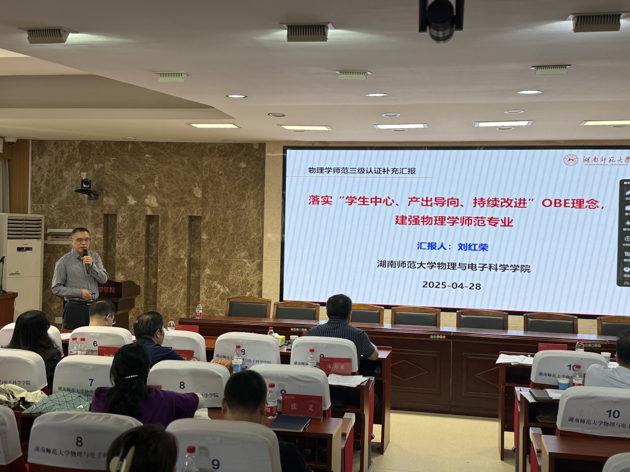 (通讯员:周心雨)2025年4月28日,湖南师范大学教务处(教育质量评估中心)组织专家对物理与电子科学学院物理学师范专业开展三级认证专项督查,督查组包括校教务处处长、教育质量评估中心主任银海强,校教学督导委员会副主任、教师教育学院原院长宋善炎,校教学督导委员会副主任、地理科学学院原副院长谭长银,外国语学院院长邓颖玲、英语系原主任陈敏哲,地理科学学院副院长李忠武,化学化工学院副院长谭亮,医学部护理学院副院长兼党支部书记何平平,教育质量评估中心副主任袁俏、评估管理科科长鲁璐青,校党委办公室副主任周旺蛟,校长办公室副主任熊卓然、欧阳文芳,人事处副处长张义,教师教育学院副院长黄元国,数据与信息化建设管理处办公室申斐。湖南师范大学原副校长匡乐满,物理与电子科学学院院长刘红荣、副院长潘启沅,物理系主任钟显辉,物理系全体教师以及学院学工办、教务办、行政办等管理人员参加此次专项督查活动。