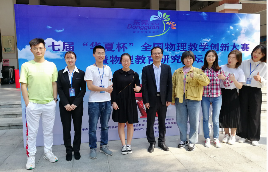 近日,物理与电子科学学院物理教学论研究生团队在刘健智教授的带领下赴东莞参加了2019年第七届“华夏杯”全国物理教学创新大赛,并在大赛中喜获佳绩:团队全员皆获“一等奖”,一人获“实验创新奖”,湖南师范大学获“优秀组织奖”,刘健智、郭桂周、宋善炎、刘翔老师皆获“优秀指导教师奖”。