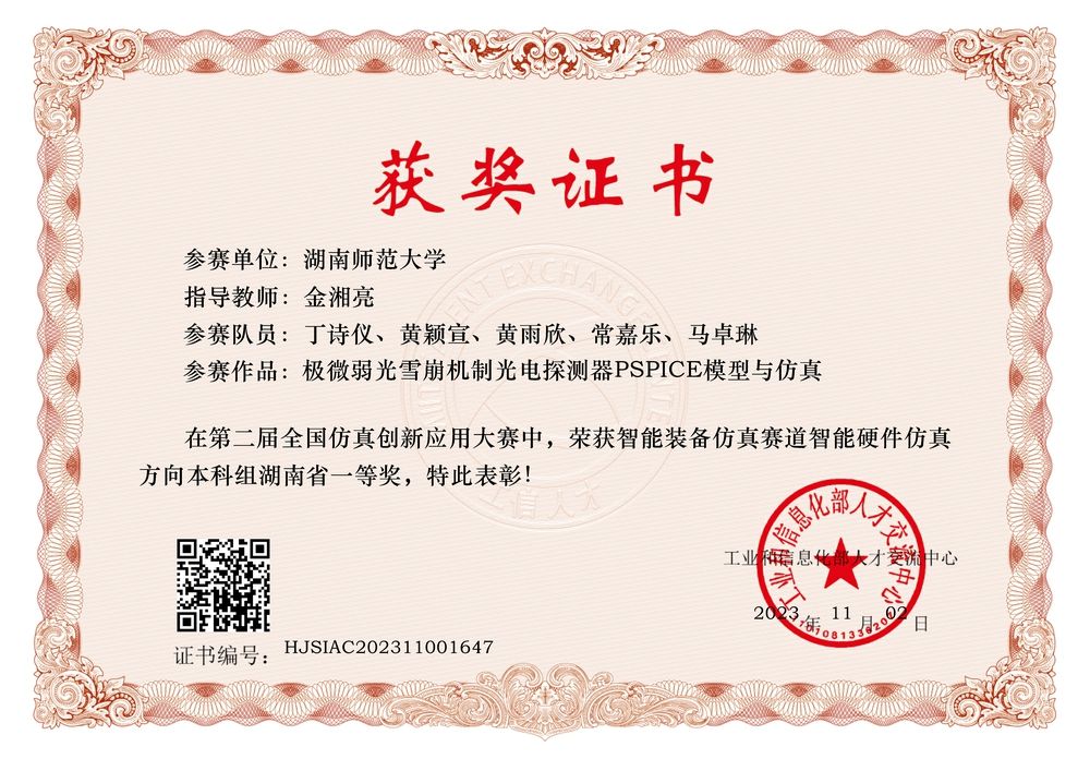 近日,由工业和信息化部人才交流中心主办的第二届全国仿真创新应用大赛全国总决赛圆满落幕,我院本科生丁诗仪团队在电子系金湘亮教授的指导下,荣获本次大赛智能硬件仿真竞赛方向全国仿真创新应用大赛全国三等奖和湖南省一等奖的佳绩。