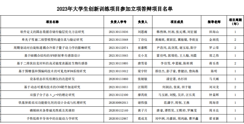 经过学生网上申报、学校组织网评和专家复评、学校审核,同意物理与电子科学学院12项创新训练项目进入立项答辩评审阶段。请名单中的12项创新类项目准备好答辩ppt,于5月18日下午参加学校立项答辩,请各位老师通知名单内的项目负责人(学生)加入“2023年大学生创新项目群(仅创新类)”QQ管理群:324888847。具体时间地点安排另行通知。