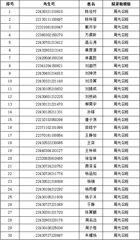 根据《湖南师范大学世承书院2022年招生选拔方案》文件精神,按照物理与电子科学学院2022级周光召班招生选拔相关要求,我院组织完成了2022级周光召班招生选拔工作。现将拟录取名单进行网上公示,公示时间为3天(8月11-13日)。考生如对拟录取公示名单有疑问,请在8月13日17:00之前向2022级周光召班招生选拔工作办公室反映(联系电话:0731-88872523)。