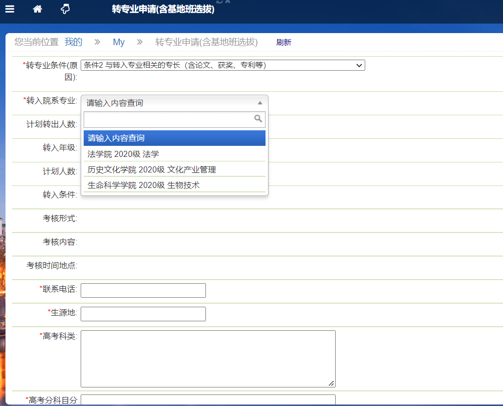 4、选择转专业条件后,在转入院系专业字段,选择自己想要转入的院系专业,按照要求填写下方所需信息后,点击【申请】按钮提交申请。